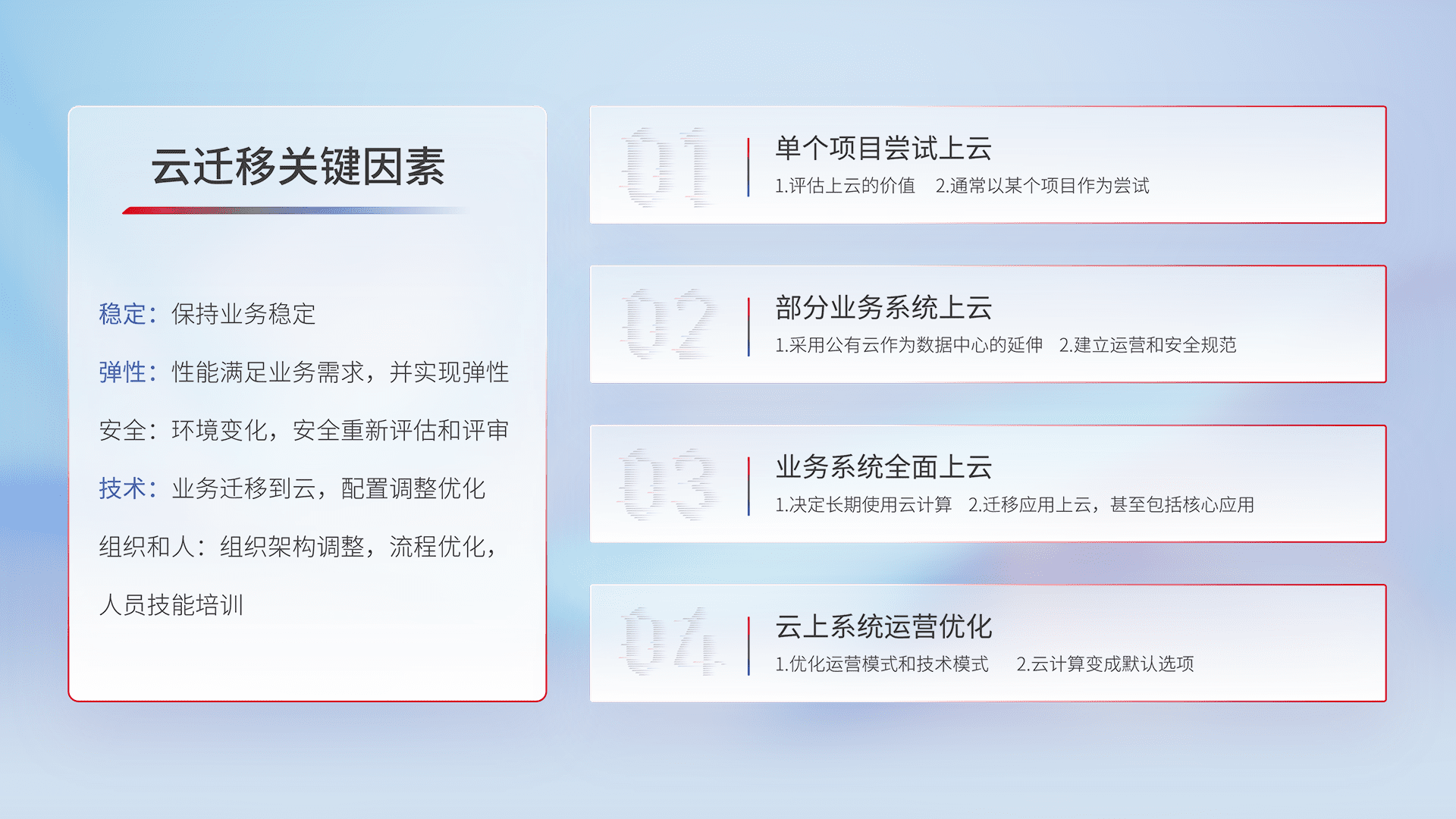 结合实际业务,,,从规划设计、、云平台选型、、、云原生改造、、数据迁移、、、、集成交付,,,迁移全过程为客户识别最佳上云路径,,,,做好风险识别管理,,设计网络架构、、、、身份权限、、、、安全审计合规、、、操作审计、、、、日志审计、、、监控告警策略、、、多站点容灾设计等,,对云上基础设施进行整体规划,,,提升IT治理水平,,,以满足弹性、、、高可用、、高性能的需求。。。