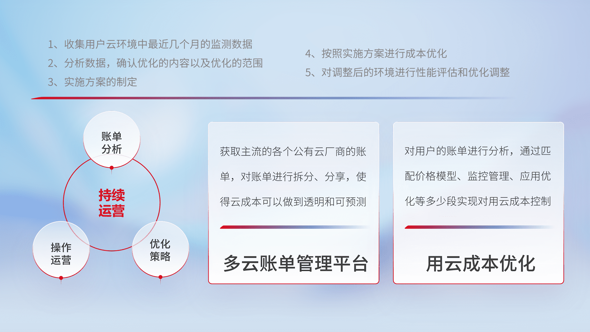 通过多云纳管,,,以统一的资源数据模型把客户的云资源进行抽象和封装,,进而实现对多云资源的统一操作,,,,保障云资源管理的可靠性、、、稳定性与可用性。。量身定制化运维内容,,配置、、、、开发运维、、补丁管理、、、备份、、监控、、、、认证和访问管理、、审计和日常巡检等,,,,保障在用云过程中的可靠度,,稳定度以及高可用率。。
