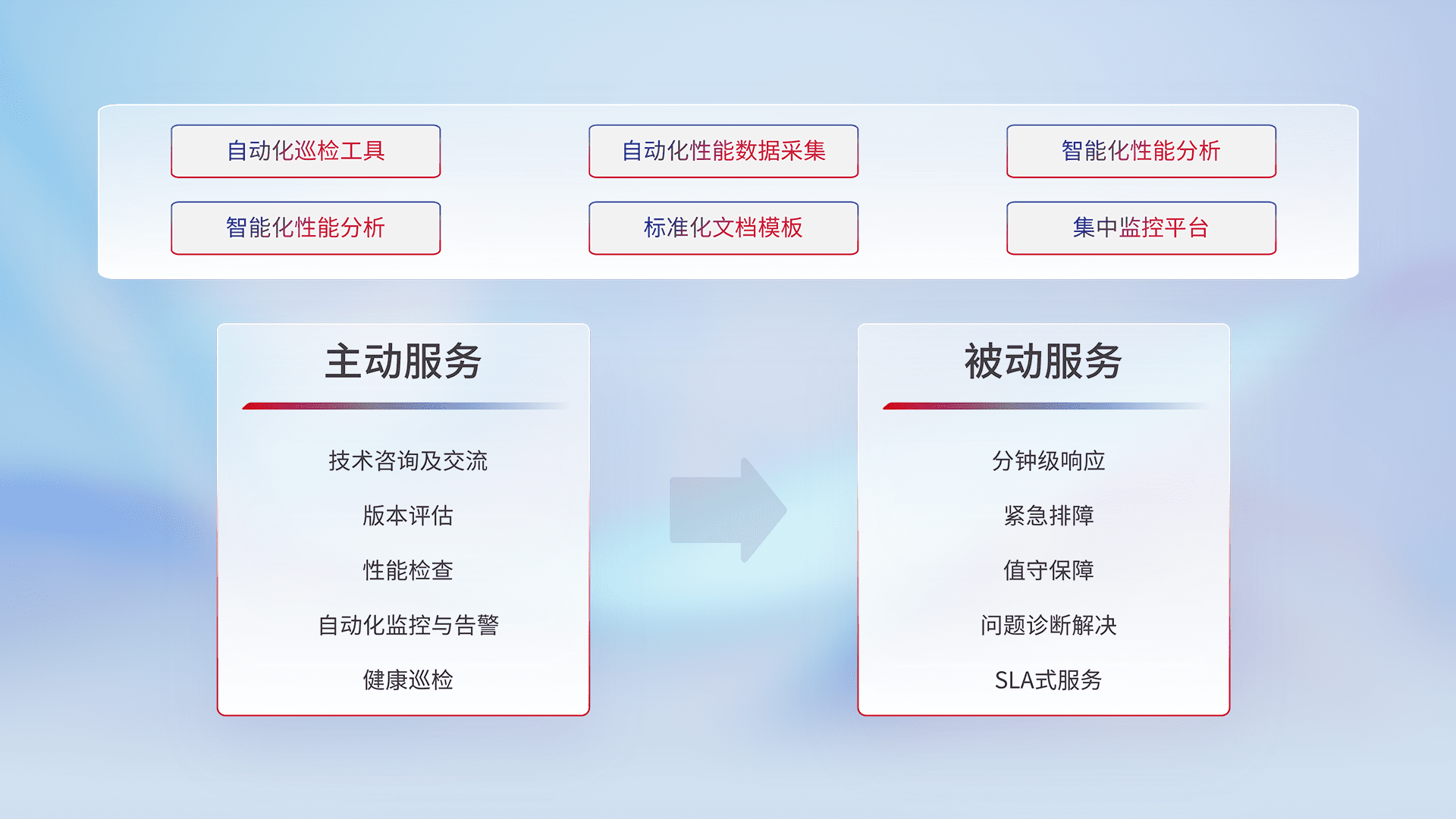 智能化工具和标准化文档,,,,保障服务质量,,,,提供主动服务(包含技术咨询、、版本评估、、、、性能检查、、自动化监控与告警、、、、健康巡检)和被动服务包含(分钟级响应、、、紧急排障、、、、值守保障、、问题诊断解决、、SLA服务)。。